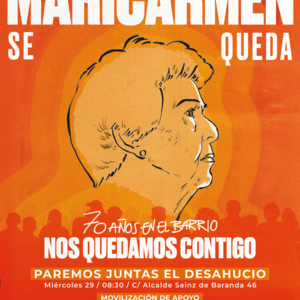 La estrategia NosQuedamos y los contratos indefinidosMaricarmen ha anunciado su decisión de permanecer en casa cueste lo que cueste. Organizada en el Sindicato, lleva más de un año en la estrategia #NosQuedamos contra los desahucios invisibles, convencida de que no sólo le asiste el derecho, sino que con ello impide que los nuevos propietarios puedan incrementar el precio del apartamento, agravando así la escalada de precios que sufre Madrid. Son ya cientos de inquilinas las que, cuando su casero les obliga a elegir entre una subida abusiva del precio o el abandono de la vivienda, se niegan a aceptar el chantaje y resisten en sus casas, pagando el mismo precio que venían abonando hasta entonces, o depositándolo ante el juzgado en el caso de que sea rechazado por el propietario. La estrategia #NosQuedamos es la única forma efectiva de frenar la escalada de los alquileres en ciudades que, como Madrid, se niegan a aplicar la regulación de precios prevista en la Ley de Vivienda estatal. Casos como el de Maricarmen ponen en el centro la necesidad de que los contratos de alquiler sean indefinidos, frente a la realidad actual que permite expulsiones cada 5 o 7 años. Los contratos indefinidos son clave para que no puedan expulsarte de tu casa tras 70 años viviendo en ella o para poder hacer proyectos de vida estables y a largo plazo que no dependan de cuándo se te acaba el contrato de alquiler. Por todo ello, el 29 de octubre a las 8.30h estaremos defendiendo la casa de Maricarmen, porque frenar esta expulsión es una forma de luchar por el derecho a la vivienda de todos los madrileños.