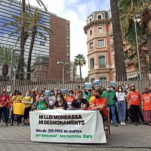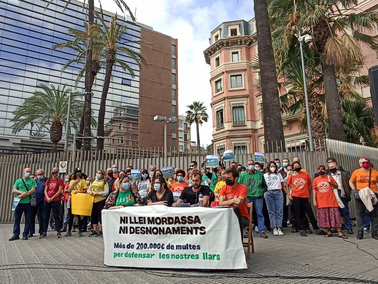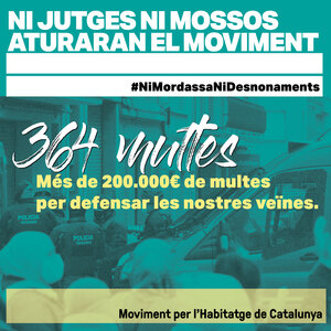 Aquest matí, 13 d'octubre, al migdia, desenes de persones d'entitats i col·lectius que defensen el dret a l'habitatge han exposat davant del Departament d'Interior la situació de repressió que està patint el moviment. L'advocada Eva Pous, d'Alerta Solidària, ha exposat les xifres d'aquesta repressió. En total, s'han documentat 364 multes, 351 de les quals en relació a desnonaments, des del març del 2019 fins l'octubre del 2021, per un valor total de 206.141,00 €. Totes aquestes multes estan impulsades pel Departament d'Interior i es basen en la "llei mordassa" (Llei Orgànica 4/2015, de 30 de març, de protecció de la seguretat ciutadana), concretament en els articles 36.4 (obstrucció), 36.6 (desobediència) o 37.4 (falta de respecte).